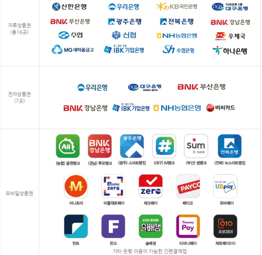 온누리상품권 전자상품권 판매처 : 우리은행, 대구은행, 부산은행, 경남은행, 기업은행, 농협은행, 비씨카드