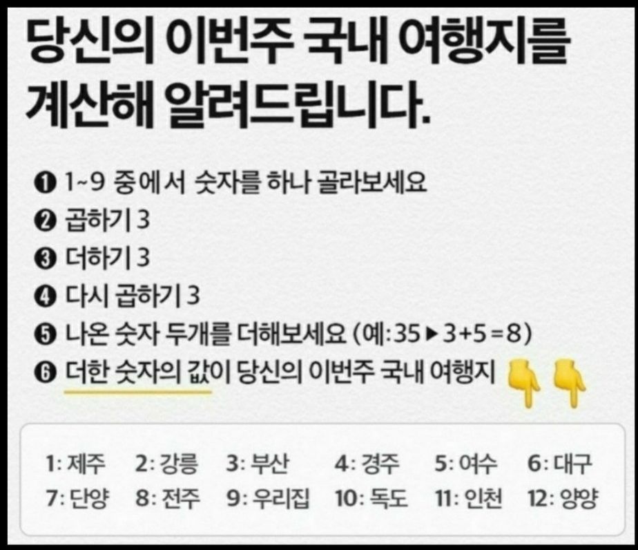 추석 연휴 국내여행지 추천 어느 장소로 나왔나요? 어디를 고른들 무조건 9번 우리집이 나오는건데 이정도면 어디 가지 말라는겁니다. 코로나로 인하여 사회적 거리두기 때문에 고향방문도 하지말라고 2021추석 고속도로 통행료 면제도 안되는데 어디가시려구요!