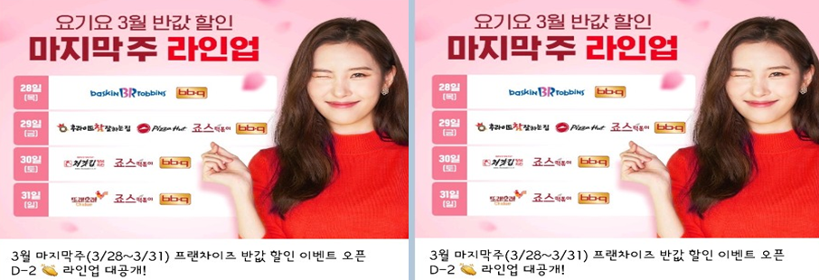 3월 한달간 요기요 반값할인 진행으로 많은 인기를 끌었던 요기요 반값할인 3월 마지막주 라인업이 공개되었다.