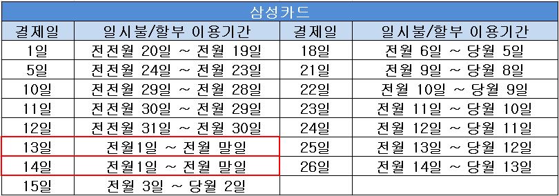 삼성카드 결제일별 사용기간