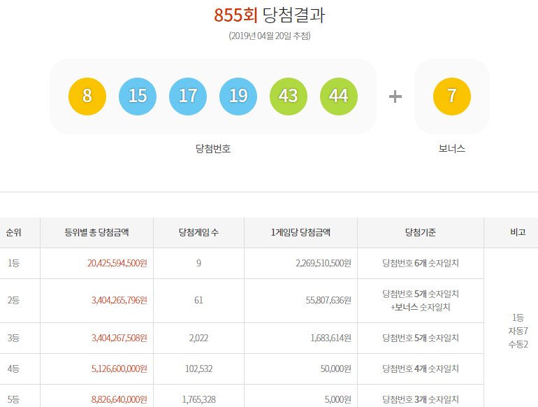 855회 로또당첨번호, 당첨지역 결과발표가 금일 4월20일(토) 8시45분 경 MBC에서 진행 되었습니다. 855회 로또당첨번호 1등 번호는 8, 15, 17, 19, 43, 44 이며, 보너스번호는 7 이며 1등 당첨자는 총 9명이며, 자동7명 수동2명, 855회 로또당첨번호 1등 1명당 당첨금은 약 22억6,900만원 정도입니다.