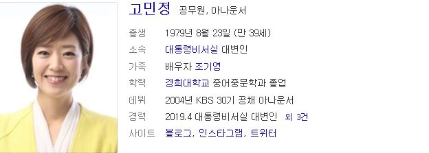 KBS 아나운서 출신인 고민정 부대변인은 지난 19대 대선에서 문재인 후보 경선 캠프와 더불어민주당 선거대책위원회 대변인을 맡으며 정계에 입문하였고, 문재인 대통령 취임 뒤 청와대 부대변인으로 지내왔다.