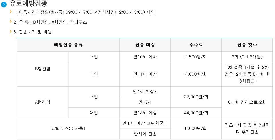 위 사진은 부산 진구 보건소 홈페이지에서 확인하였으며, a형 간염 예방접종 가격은 만 1세 ~ 만 17세까지는 1회에 22,000원, 만18세 이상 a형 간염 예방접종 가격은 44,000원 입니다. a형 간염 예방접종 간격은 6개월 간격으로 2회 접종을 하여야 합니다.