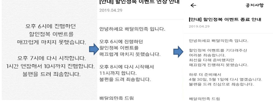 배달의 민족 할인정복 이벤트는 계속된 오류로 인하여 29일30일 예정이였던 이벤트가 4월30일, 5월1일로 다시 열릴 예정이다.
