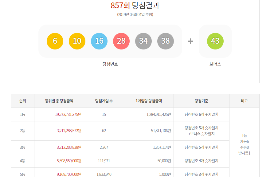 2019년 05월04일 토요일 857회 로또당첨번호 지역 결과발표가 진행 되었어요. 857회 로또당첨번호 1등 숫자는 6, 10, 16, 28, 34, 38이며 보너스숫자는 17입니다.