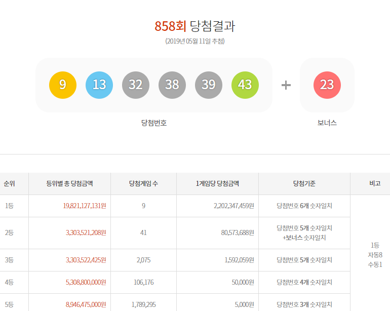 2019년 5월11일 토요일 858회 로또당첨번호 당첨지역 결과발표가 진행되었답니다. 오늘 발표한 858회 로또당첨번호 1등은 9 13 32 38 39 43 으로 보너스번호는 23입니다.