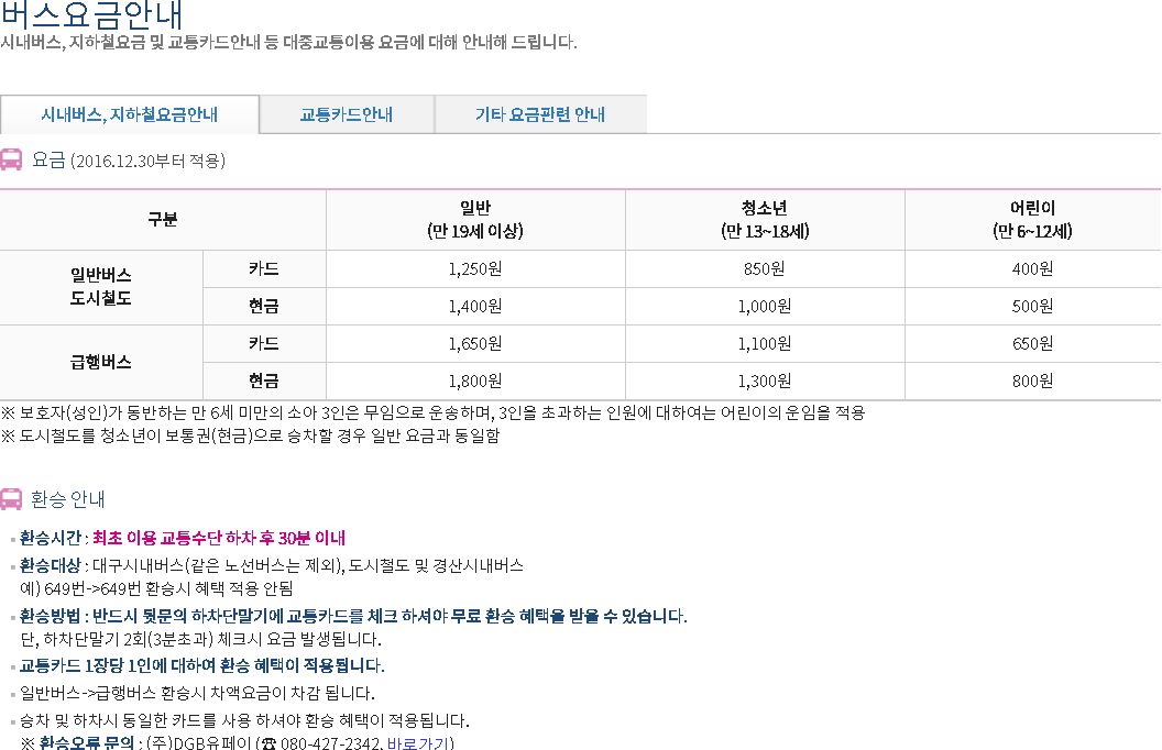 현재 대구 버스 요금, 대구지하철 요금은 일반 성인 일반버스 현금 요금은 1,400원, 청소년 13세 - 18세 현금 1,000원, 어린이 만 6세 - 12세 500원이며 교통카드 요금은 위 사진과 같다.