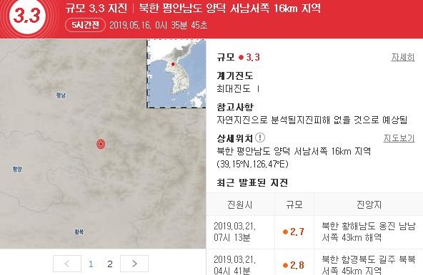 금일 2019년 5월16일(목) 북한 평안남도 양덕 서남서쪽 16km 지역에서 규모 3.3 지진이 발생하였다.