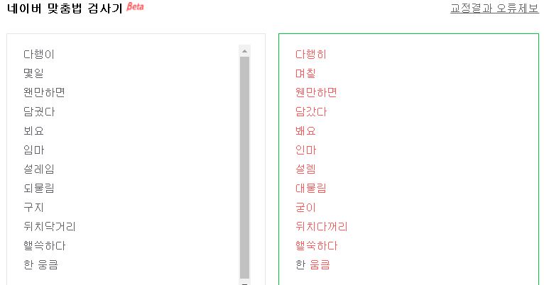 저는 네이버 맞춤법 검사기를 사용했구요, 위 사진에 왼쪽은 틀린 맞춤법이랍니다. 오른쪽이 정확한 맞춤법이구요, 네이버 맞춤법 검사기 바로가기는 아래 클릭하시면 되세요.