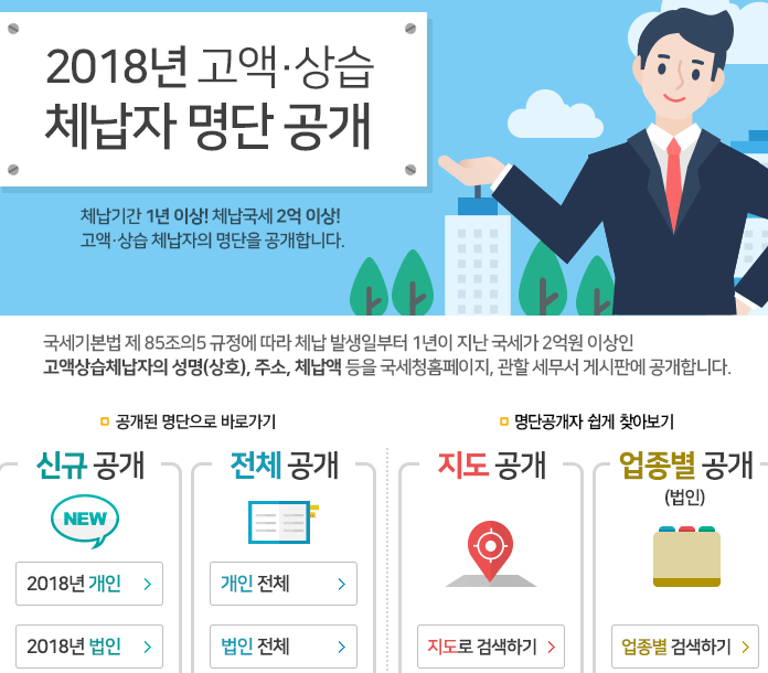 2018년 고액 체납자, 상습 체납자 명단은 국세기본법 제85조의5 규정에 따라 체납 발생일로부터 1년이 지난 국세가 2억원 이상인 고액 체납자의 성명, 법인일 경우 법인 상호, 주소, 체납액을 국세청 홈페이지, 관할 세무서 게시판에 공개하고 있더라구요.