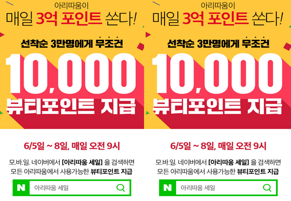 6월5일~6월8일 4일동안 오전 9시 모바일 네이버에서 아리따움 세일을 검색하면 아리따움에서 사용이 가능한 1만포인트를 선착순 3만명에서 무조건 주는 이벤트를 진행하고 있답니다.