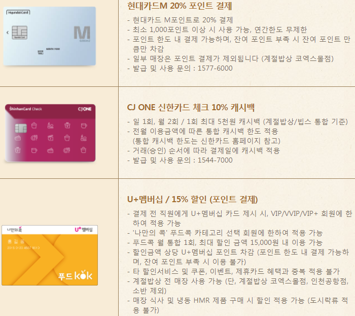 CJ one 신한카드 체크카드 10% 캐시백이 가능하며 1일 1회, 월2회 최대 5천원 캐시백이 가능하구요, 엘지유플러스 멤버십 포인트 결제로 15% 할인이 가능하지만 계절밥상 할이능ㄹ 받으시려면, 엘지유플러스 멤버십 등급이 VIP, VVIP, VIP+ 회원만 나만의 콕 푸드콕 카테고리 선택한 멤버십에 대해서만 계절밥상 할인 적용이 가능하답니다.