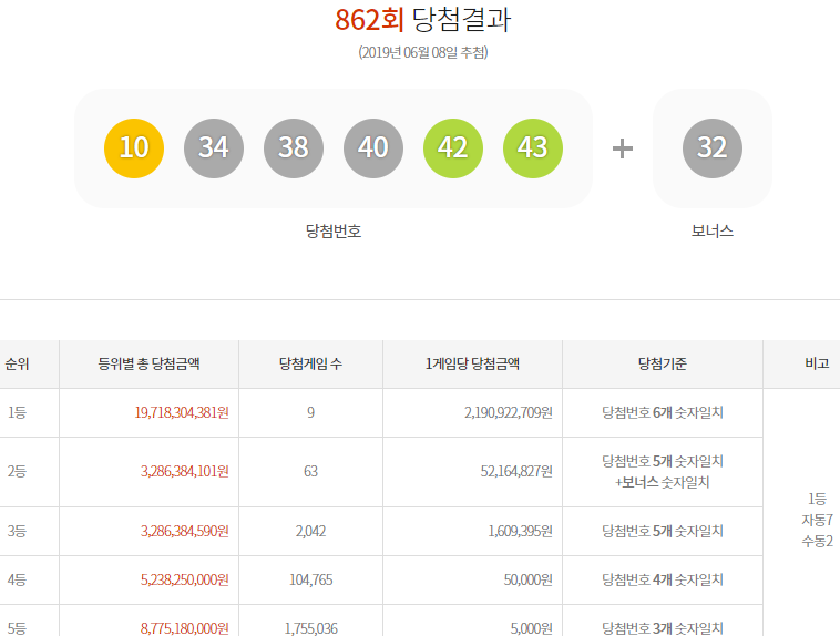 2019년 6월8일 토요일 862회 로또당첨번호 지역 발표가 진행되었어요.!! 오늘 발표한 862회 로또당첨번호 지역 결과방송 추첨은 모델 김칠두시 아시나요!? 김칠두시가 추첨을 도와주셨는데요, 862회 로또당첨번호 1등 숫자는 10, 34, 38, 40 ,42 ,43이며 2등 보너스번호는 32으로 1등은 총 9명의 당첨자로 자동7 수동2명이 나왔답니다.