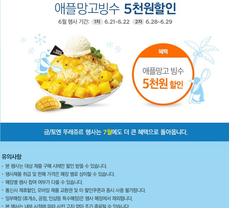 뚜레쥬르 6월 금,토는 애플망고빙수 5천원 할인으로 혜택 받으시고~ 7월, 8월에도 뚜레쥬르에서 많은 혜택이 쏟아져 나왔으면 좋겠네요.