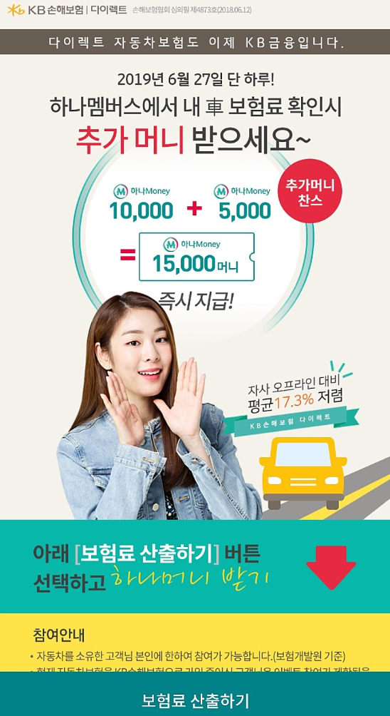 6월27일 (금) 딱 하루만 하나멤버스에서 KB손해보험 다이렉트 자동차보험 견적만 받아도 추가머니 찬스가 주어져 15,000원이 지급되는데요, 다이렉트 자동차보험 가입하시는분들은 만기 한달전부터 혜택을 받을 수 있으니, 여기저기 따져보고 최고 혜택 받으셔서 다이렉트 자동차보험 가입하시면 된답니다.