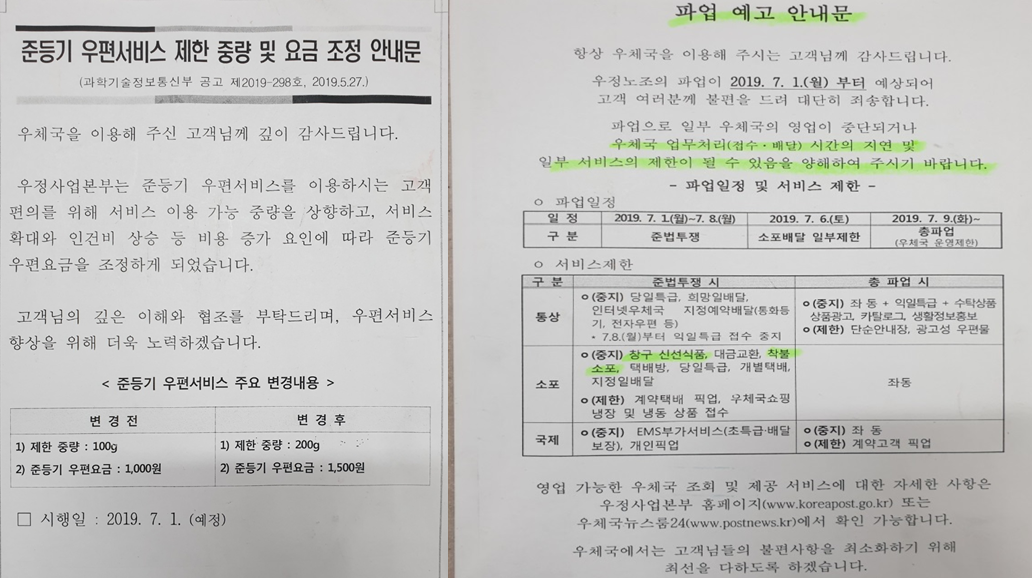 또 얼마전 우체국 직원 과로사로 인한 기사를 보셨다면 아실텐데요, 우체국 우정노조 파업이 7월1일부터 예상되어 전국 우체국의 영업이 중단되거나 우체국 업무처리 택배, 등기, 우편물 등 배달 시간 지연 및 일부 서비스가 제한이 될 수 있다고 하더라구요.