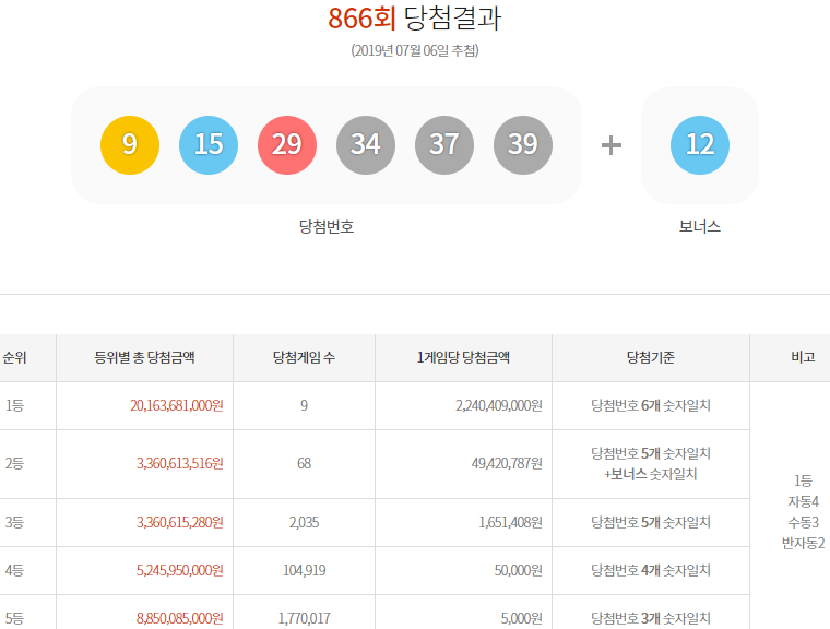 866회 로또당첨번호 1등 번호는 9 15 29 34 37 39이며 2등 보너스번호는 12이며, 자동 4명, 수동3명 반자동2명으로 총 9명이 나왔답니다.
