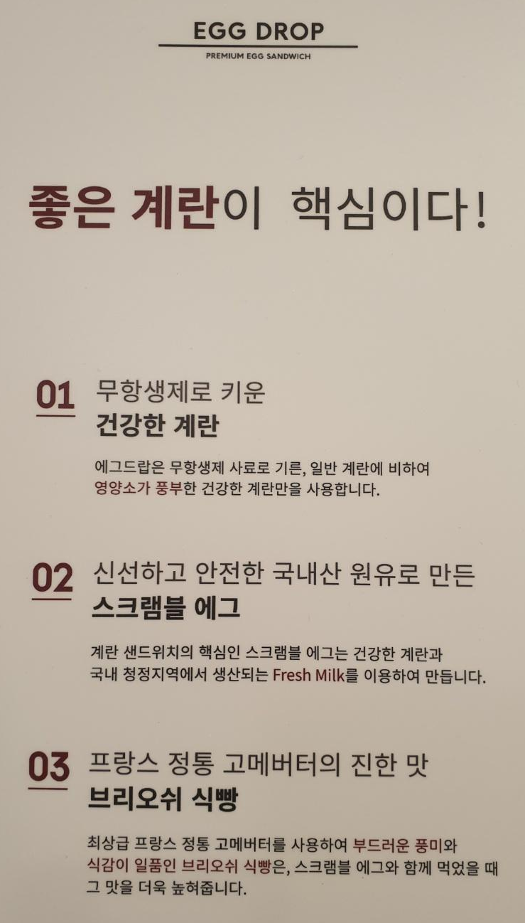 에그드랍은 아메리칸 다이너를 모티브로 한 영양이 풍부한 스크램블 에그를 요리한 뒤 브리오쉬에 에쁘게 담아 제공하는 곳으로 합리적인 가격 샌드위치를 아메리칸 다이너식으로 맛 볼 수 있는 곳이라고 하는데요, 부산, 대구, 서울, 강남, 대전, 광주 등 전국적으로 요즘 인기가 있나 보더라구요.