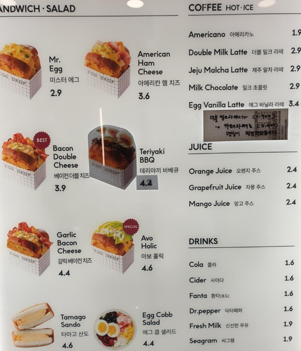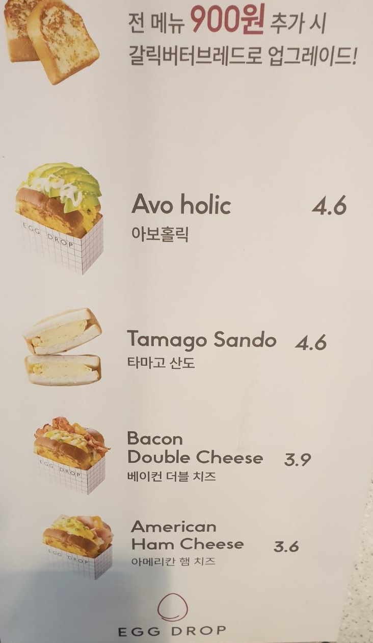 에그드랍 메뉴는 미스터 에그, 아메리칸 햄 치즈, 베이컨 더블치즈 샌드위치, 데리야끼바베큐 샌드위치, 갈릭베이컨 치즈, 아보 홀릭 샌드위치, 타마고 산도 샌드위치, 에그 콥 샐러드 이렇게 있더라구요.