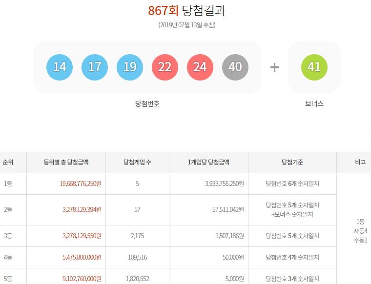 오늘 발표된 867회 로또 당첨 번호 1등 숫자는 14, 17, 19, 22, 24, 40 이렇게 6개의 숫자이며 2등 보너스번호는 41로 1등 당첨자는 총 5명밖에 안나왔어요!!!! 그래서 당첨금이 약 39억3,375만원이랍니다. 최근들어 가장 큰 당첨금인것 같아요.
