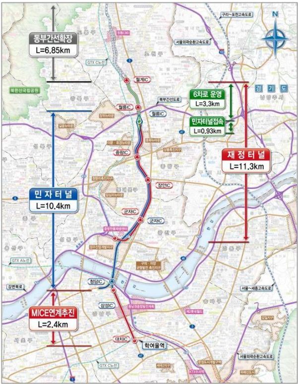 동부간선도로 지하화 민간투자사업은 영동대로 경기고앞 - 동부간선도로 월릉교 구간이 평소 상습 정체와 집중호우 때마다 침수되었던 동부간선도로를 현행 6차로에서 8차로로 확장하여 지하화 하는 사업이라고 합니다.