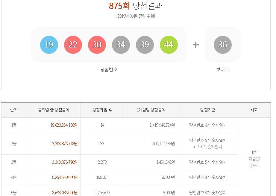 875로또 당첨 번호 1등의 숫자는 19, 22, 30, 34, 39, 44 이며 2등의 보너스번호는 36이며 당첨자는 총 14명으로 1명당 14억 정도의 당첨금이 지급됩니다.