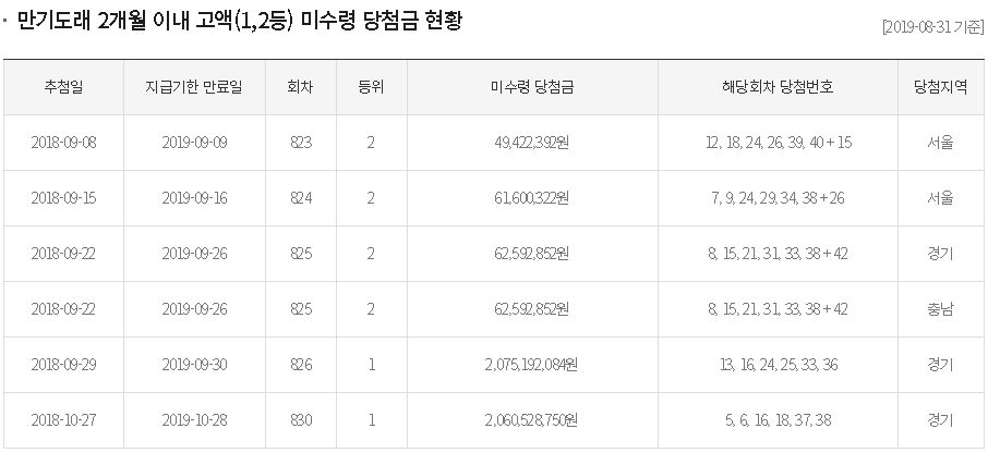 로또 당첨금은 지급개시일로부터 당첨일로부터 1년이내에 지급을 받아야 되는데요, 아래 만기도래 미수령 당첨금 당첨지역 현황좀 봐주세요!!!! 9월9일, 9월16일, 9월26일 2등 당첨이 4개나 있고, 10월까지 미수령 1등도 2명이나 있어요. ㅠㅠ 제발 집에 굴러다니는 로또 복권 없는지 확인하시고 꼭 기간내에 수령하시길 바랄게요.