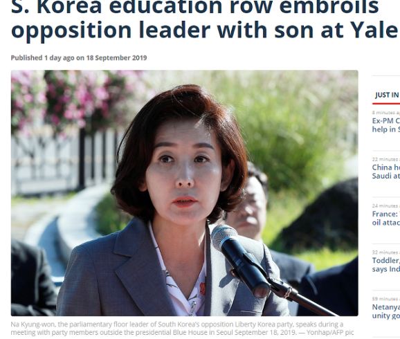 나경원 AFP 기사를 보면 한국 교육 스캔들에 야당 지도자와 나경원 아들이 줄지어 휘말리다 라는 기사의 제목으로 보도하게 되면서 나경원 AFP 기사가 실시간 검색어에 오르고 있더라구요.