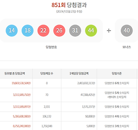 851회 로또당첨번호, 당첨지역 851회 로또당첨번호, 당첨지역 결과발표가 로또 추첨시간인 2019년 3월23일 토요일 8시45분 MBC에서 방송 되었어요. 851회 로또당첨번호 1등 번호는 14, 18, 22, 26, 31, 44이며, 보너스 번호는 40으로, 자동 6명 수동 2명으로 총 8명으로 약 24억원 정도의 당첨금이에요. 8명밖에 당첨되지 않아 당첨금이 많은 것 같더라구요. 로또 판매시간은 추첨일인 토요일 저녁 8시에 판매가 마감되며, 로또 추첨일인 토요일 저녁 8시부터 일요일 오전 6시까지는 판매가 되지 않아요. 이번 851회 로또 당첨 번호 1등 당첨금은 약 24억 정도, 851회 로또 당첨번호 2등은 총 70명으로 약 4,700만원 정도의 당첨금 입니다. 851회 로또 당첨번호 1등은 자..