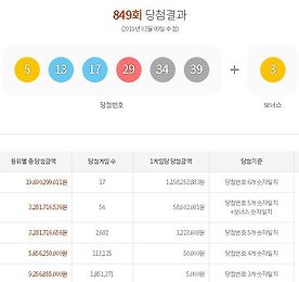 849회 로또 당첨번호, 당첨지역 849회 로또 당첨번호, 당첨지역 결과발표가 2019년 3월9일 토요일 8시45분 MBC에서 방송되었네요. 로또 추첨시간은 매주 토요일 8시45분입니다. 849회 로또 당첨 번호 1등 번호는 5, 13, 17, 29, 34, 39이며, 보너스번호는 3 입니다. 이번 849회 로또 당첨번호 1등 당첨자 수는 자동 10명 수동 6명, 인터넷복권판매사이트(동행복권) 1명으로 총 17명입니다. 로또 판매 마감 시간은 추첨일인 토요일 저녁 8시에 판매가 마감되며, 로또 추첨일인 토요일 저녁 8시부터 일요일 오전 6시까지는 판매가 되지 않아요. 이번 849회 로또 당첨번호 1등 당첨자수는 총 17명이고, 849회 로또 당첨번호 1등 당첨금은 약 11억원 , 849회 로또 당첨번호 ..