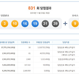 2018년 11월3일 토요일 831회 로또 당첨 번호, 당첨지역 결과 발표가 있었어요. 831회 로또 당첨 번호 함께 알아보도록 할게요. 831회 로또 1등 당첨자는 총 16명이며, 자동 7, 수동 7, 반자동 2 입니다. 831회 로또 당첨 번호는 3, 10, 16, 19, 31, 39 입니다. 보너스 숫자는 9입니다. 831회 로또 1등 당첨금액은 약 10억원입니다. 2등 당첨자는 61명으로 약 4,800만원, 3등은 2,660명 약 100만원 4등은 117,332명 5만원, 5등은 1,849,959명 5천원 입니다. 831회 1등 로또 당첨지역 서울 도봉구 쌍문동 삼호복권, 서울 서초구 서초동 서초대박로또, 서울 은평구 녹번동 바이더웨이 녹번 중앙점, 서울 종로구 종로5가 제이복권방, 부산 연제구 ..