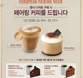 투썸플레이스에서 10월11일 목 - 10월17일 수요일 일주일 간 행사중인 케익 메뉴 구매 시 페어링 커피 1잔 무료 증정 이벤트를 진행합니다. 10월11일 - 10월17일 까지만 진행하는 투썸플레이스에서 행사 케이크 구매 시 페어링 커피 증정이라고 하니, 디저트 좋아하시는 분들은 케이크도 드시고, 커피도 꽁짜로 드세요! 골드링 카푸치노, 아메리카노 오리지널, 더블브루 커피 메뉴 3종 중 1잔 무료 증정이며, 행사 디저트 메뉴는, 카푸치노 생크림 케익, 벨지안가나슈 케익, 더치솔티드카라멜 케익까지 3종 입니다. 행사 케익 메뉴 1개당 증정 커피 1잔이며 골드링 카푸치노와 더블브루는 숏 사이즈, 아메리카노는 레귤러 사이즈로 제공 된다고 합니다.중복혜택 적용 불가하며, 행사 진행여부 및 재고 소진은 점포별로..