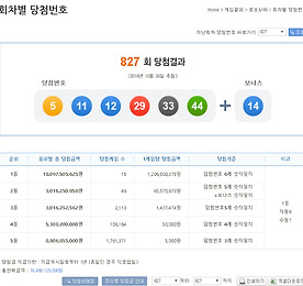 827회 로또 당첨 번호, 당첨지역 결과발표 확인하세요. 2018년 10월6일 토요일 827회 로또 당첨 번호는 5, 11, 12, 29, 33, 44이며 보너스번호는 14입니다. 이번 로또 827회 1등 당첨 게임 수는 15장 이며, 자동 8장, 수동 7장 입니다. 827회 1등 당첨자는 총 15명이며, 당첨자 1명당 당첨금액은 약 12억원 정도 입니다. 1등 당첨기준은 6개 번호 숫자일치, 2등 당첨기준은 5개 번호 숫자일치 + 보너스 숫자이며, 2등 당첨자는 총 46명 입니다. 3등 당첨기준은 5개 번호 숫자 일치이며 총 2,113명, 4등은 4개 숫자일치로 106,164명, 5등은 3개 숫자일치로 1,761,371명 입니다. 1등 당첨금 지급 장소는 농협 본점 서울시 중구 충정로 1가 85번지 1..