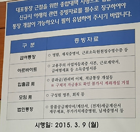 우리은행 신규 입출금 통장 개설 필요 서류(자료) 확인하세요. 2015년 3월9일 부터 모든 은행에서 대포통장 근절을 위한 종합대책 시행으로 입출금 통장 신규 개설이 까다로워 졌습니다. 신규 입출금 통장 개설 치 필요 증빙서류(자료)를 지참 하여야 통장 개설이 가능합니다. 급여통장: 명함, 재직증명서, 근로소득원천징수 영수증아르바이트: 사업자등록증 사본, 근로계약서, 급여명세표 등 소득증빙을 할 수 있는 서류입출금: 공과금, 관리비 이체, 적금 통장 개설용은 구체적인 자금 용도 확인 불가시 신규 계좌 개설이 불가능 합니다.모임: 구성원 명부, 회칙 등법인통장: 물품공금 계약서, 계산서, (전자)세금 계산서, 재무제표, 부가가치세 증명원, 납세증명서 등 신규 입출금 통장 개설 시 필요한 증빙서류(준비물) ..