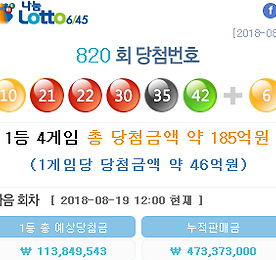 2018년 8월18일 토요일 로또 820회 당첨번호, 당첨지역 확인하세요. 820회 로또 1등 당첨번호는 10, 21, 22, 30, 35, 42 이며 보너스 번호는 6 입니다. 이번 로또 820회 당첨번호 1등 당첨사 수는 1등 자동 3명, 수동 1명으로 총 4명이며, 2등 당첨자 수는 총 60명 입니다. 로또 판매마감 시간은 로또 당첨발표 일인 토요일 오후 8시까지 로또 판매점에서 구매 가능하며, 로또 1등 당첨번호 결과발표 당첨시간은 매주 토요일 저녁 8시 40분 SBS에서 생방송으로 진행되고 있습니다. 820회 로또 1등 당첨지역 경기 수원시 장안구, 경기 의왕시 왕곡동, 경남 양산시 평산동, 경남 통영시 봉평동 입니다. 8월25일 토요일 821회 로또 당첨번호 기대해보아요.