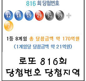 7월21일 토요일 로또 816회 당첨번호 결과발표 당첨지역 안내입니다. 816회 로또 당첨번호 1등 결과발표는 자동 6명 수동 2명 으로 총 8명으로, 약 21억원 입니다. 2등 당첨자 수는 67명 이벼, 약 4천만원 입니다. 로또 구매 판매 시간 토요일 오후 8시 까지 구매 가능하며, 로또 1등 당첨번호 결과 발표 당첨 시간은 매주 토요일 저녁 8시 40분 SBS에서 생방송으로 진행됩니다. 로또 816회 1등 당첨번호 12 18 19 29 31 39 이며, 당첨지역 서울 강서구 내발산동, 부산 해운대구 반여동, 경기 평택시 서정동, 강원 삼척시 남양동, 충북 진천군 진천읍 벽암리, 충남 홍성군 광천읍 광천리, 경북 구미시 상모동, 경북 영천시 야사동 까지 당첨지역 입니다. 7월28일 로또 817회 1등..